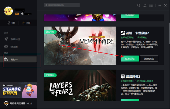 下载奇游客户端,选择“喜加一”分栏,点击《战锤:末世鼠疫2》免费领取按钮,加速后跳转至领取页面: