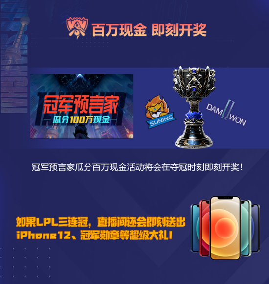 冠军预言家瓜分百分现金活动将会在夺冠时刻即可开奖!如果LPL三连冠,直播间还会即刻送出iPhone12、冠军勋章、LOL手办等丰富大奖!