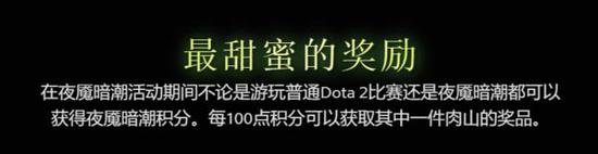 在夜魇暗潮活动期间不论是游玩普通Dota 2比赛还是夜魇暗潮都可以获得夜魇暗潮积分。每100点积分可以获取其中一件肉山的奖品。