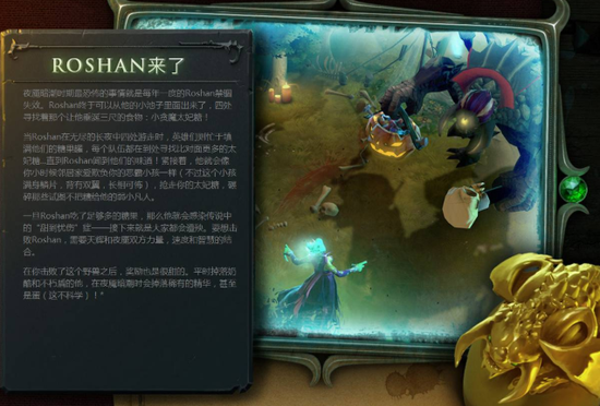 roshan觉醒,肉山会离开巢穴并向双方队员索要糖果,随机选中一名玩家,先礼貌索要糖果,如果你不给,就会把你追杀致死,除非给他糖果,会暂时坐下吃糖,然后换目标为另一支队伍的人。