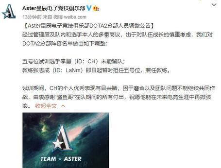 Aster星辰电子竞技俱乐部DOTA2分部人员调整公告