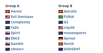两支丹麦队伍Heroic和Astralis分别领衔A组、B组。同时还有G2、FaZe等一众强队以及从北美远渡重洋参加比赛的FURIA以及EG。通过资格赛晋级的两支队伍Gambit和c0ntact被分入A组,分别在首场比赛中对阵EG以及Heroic。