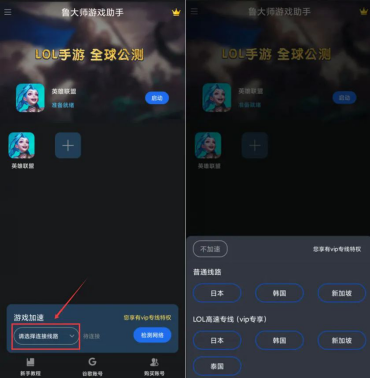 紧接着,玩家可以根据自己游戏添加的进行【连接线路】选择,登录账号,新玩家输入手机号码自动注册账号,登录成功后根据自己的需求选择连接线路,LOL手游还有专线,新用户赠送24小时免费使用时间。