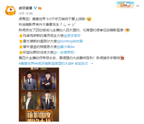 近日微博上#魔兽打工天团 的话题悄然兴起,四方打探后笔者得知,虎牙官方发起了“魔兽盟约大战”新版本预热活动。四大知名主播将化身“打工人”入驻暗影界,化身各个盟约的形象大使,准备带领艾泽拉斯上的诸位脚男们开启一场属于打工人的旷日大战。