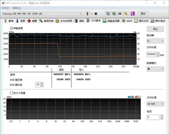 在前文参数介绍中提到,三星980PRO采用了智能TurboWrite 2.0技术,在之前的SSD基础上进行了优化升级,可自动识别用户的工作负载,并指定合适的SLC缓冲区,也就是说TurboWrite2.0能够智能的识别用户当前的存储工作负载,根据负载的不同,动态调整高性能SLC写入缓冲区配比;在缓存容量方面,相较于初代的TurboWrite机制,提供了高达5倍的缓冲区容量,正是前面说到的6GB默认缓存+108GB动态智能缓存。而缓存最大的作用就是保证SSD在大容量文件传输时不掉速。在这里选择HD Tune Pro进行了详细测试。