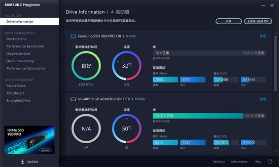 如果你想随时监测三星980PRO的运行状态,三星SSD魔术师管理软件就是个相当好用的东西。通过这个软件,用户可以方便的查看固态硬盘的型号,温度、固件、接口等关键信息,同时三星Magician还内置了性能测试软件,方便用户掌握固态硬盘产品的具体性能。