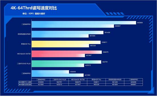 在AS SSD软件测试(10GB文件写入量设置)下,三星980PRO的4K随机性能遥遥领先。可能有人发现PCIe3.0 SSD的性能表现也相当不错,这就充分说明PCIe 4.0 X 4通道,更能让SSD的性能发挥到极致。在相同的环境下,三星980PRO 4K随机写入超过845K IOPS,相比旗舰级PCIe3.0 SSD速度提升了接近50%,相比第一代PCIe 4.0主控SSD竟也接近50%。(PS:这里可能存在测试平台的差异)4K随机读取超过666K IOPS,在PCIe3.0基础上提升了54.5%,比第一代PCIe 4.0主控性能提升了43.2%。