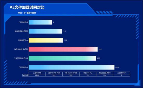 而在AE文件加载测试中,PCIe4.0 SSD与PCIe3.0 SSD时间差距很大。在整个加载过程中,因为文件并不是很大,三星980PRO的进度条几乎是刚出现就消失了;其他PCIe4.0 的表现也相当不错;但是相比PCIe3.0 SSD,进度条确实存在时间够久的。