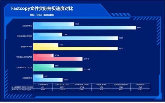 在实际拷贝测试中,在这里进行了软件测试和专业软件应用检测。在Fastcopy测试中,三星980PRO 的性能优势体现得相当明显。在拷贝单个大容量文件时,由于并未超过动态缓存容量,平均传输速度达到了4392MB/s,而写入大量零散文件时,平均速度也高达1747MB/s,相比其他PCIe 4.0 SSD的传输速度提升幅度相当大,更不用说与PCIe3.0 SSD之间的差距了。