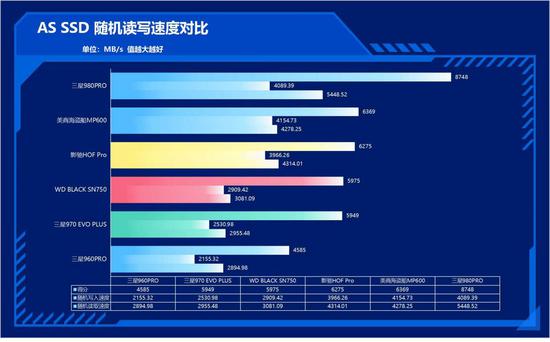 得益于PCIE4.0带宽上的升级,在AS SSD测试中,三星980PRO 1TB NVMeM.2 SSD的4K随机性能得到了很大的提升。从成绩中,我们看到最大随机读取的IOPS值达到了668917 IOPS,最大随机写入值则达到了843004 IOPS,4K随机读取达到21492 IOPS,4K随机写入达到53111 IOPS,总分达到8735,高性能看得见。