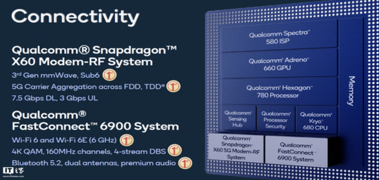 FastConnect 6900 还集成支持双天线的蓝牙 5.2,160MHz 信道带宽和 4 路双频并发,为骁龙 888 提供强大的连接性能。