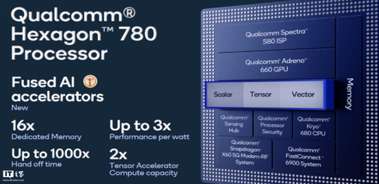 在骁龙 888 上,Hexagon 处理器也经过了重新设计,今年的 Hexagon 780 采用了融合 AI 加速器架构。