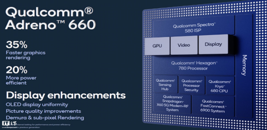 此外,Adreno 660 不仅是一个图形引擎,还是一个出色的显示引擎,可实现最佳的图像质量,例如支持 OLED 显示一致性、显示图像质量的提升以及 Demura 和亚像素渲染技术,以进一步提高智能手机显示的图像质量。