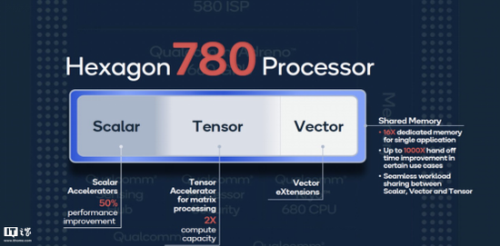 不仅如此,高通还在这三个不同加速器之间添加了很大的共享内存,从而让他们更快、更高效地共享和移动数据。高通称,专用共享内存的加入让 Hexagon 780 在单一应用中的性能提升 16 倍,在某些应用中,数据交互时效最多可提高上千倍。