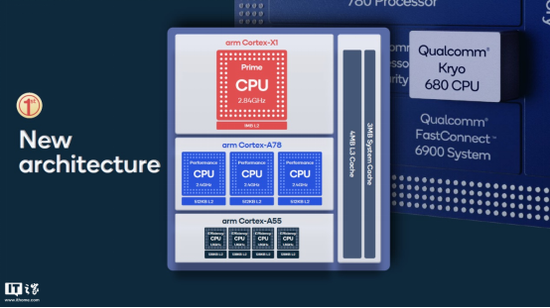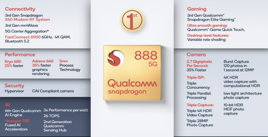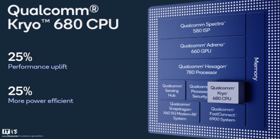 今年骁龙 888 移动平台的 CPU 为 Kryo 680 CPU,其采用了全新 CPU 架构,是行业首个采用 ARM Cortex X1 架构的移动平台。