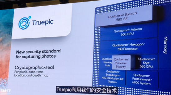 其次,骁龙 888 还用上了高通在 2018 年开通的无线边缘服务。这项服务中,开发人员可以将其集成到他们的应用程序和服务中,从而实现对设备的安全远程管理。在峰会上,高通演示了利用其终端侧安全技术和高通无线边缘云服务来保护未来摄影的功能。