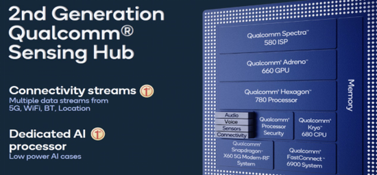 在第六代 AI Engine 架构中,还整合了高通第二代传感器中枢。今年的第二代传感器中枢中,高通增加了一颗专用的、始终开启的、低功耗的 AI 处理器,令传感器中枢 AI 性能提升达 5 倍。这种额外的 AI 处理能力使 Hexagon 处理器可以将高达 80% 的工作负载分担给传感器中枢,从而做到更加省电。高通传感器中枢进行所有处理所需的功耗仅仅不到 1 毫安。