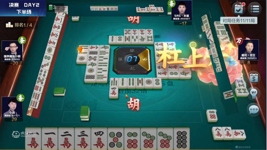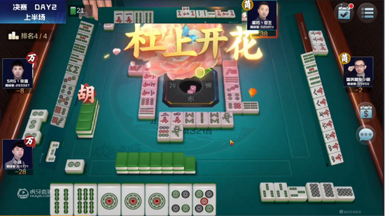 已进决赛对局,四家打法不尽相同但同样略有顾虑,气氛一直不温不火,几副小牌互相“刮痧”。就在这时来自星秀主播的老王突然发难,一手赏心悦目的杠上开花对对胡拿下32分的巨大优势。运势逼人的老王随后频繁胡牌,稳中求大慢慢扩大分差,以47分的巨大优势领跑第一,结束了上半场的对局。