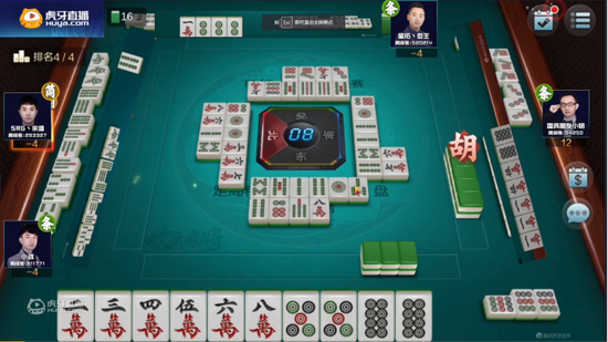 四位选手中“国民朋友小明”是来自欢乐麻将分区的“本质”主播。俗话说术业有专攻,小明在本次比赛一直是观众看好的夺冠热门,然而上半场-20分的巨大劣势,让他的夺冠之路显得举步维艰。与此同时,积分优势巨大的老王也并不顺利,下半场几次大牌进攻都没能获得成效,小战的高分自摸让老王雪上加霜,积分变为-31。比赛时间已经所剩无几,局势逐渐白热化,下半场豪取40多分的小战似乎已经逆转老王锁定胜局。