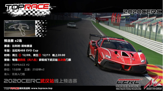 感谢4位专业选手为大家带来的一场精英竞速盛宴12月15日,中国电竞赛车锦标赛(CERC)20-21赛季第五站将于武汉良友红坊文化艺术社区举办,目前已正式开放线上海选通道,欢迎广大电竞汽摩爱好者踊跃加入报名。