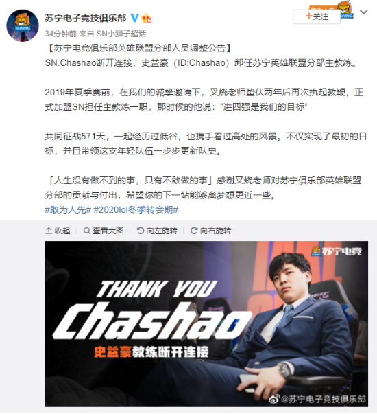 苏宁电子竞技俱乐部今日发布人员调整公告,史益豪(ID:Chashao)卸任苏宁英雄联盟分部主教练。