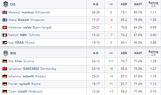 两支以战术体系为重的队伍率先来到了Dust2这张需要靠枪法拿分的地图,BIG率先进入状态,4-1领先后,随着mantuu完成最后的补枪,OG吹响反攻的号角连拿5分反超比分。上半场后半段两边逐渐陷入胶着,你一分我一分得互相拿分,不过OG还是稳住了局势9-6领先进入下半场。不过当BIG来到防守方开始发力,k1to稳如磐石的B区让队友安心。XANTARES和tabseN也发挥有加,让BIG从下半场开始一路拿分,稳稳压制住了OG。难以打开局面的OG找不到突破点只能被BIG蚕食12-16输掉图一。