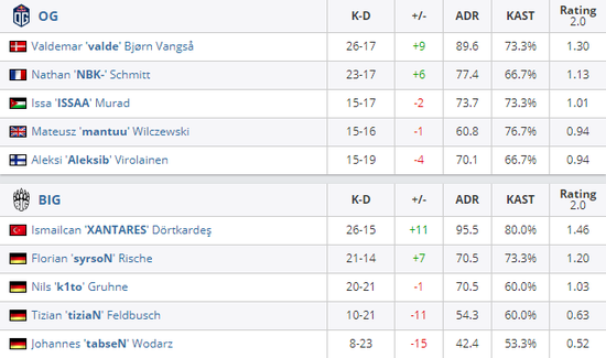 图二是OG主动选择的Inferno,虽然开局BIG取得到了一些优势,但是OG很快就找回节奏,面对OG成体系的爆弹BIG每次都差一口气。半场结束OG 10-5领先。然而双方的实力很接近,BIG进入到进攻方也是大展拳脚,两支战术队的博弈往往是默认控图的点点细雨之后便是一波爆发,在更优质的补枪效率中,BIG逐渐追回了分数。XANTARES再次表现出了顶级枪男的爆发力,最后一个关键局他的突破打开局面,syrsoN大狙三杀帮助BIG终结比赛,2-0带走OG。