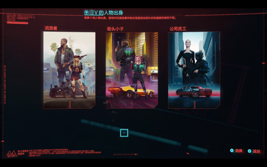 玩家将扮演经过赛博强化的佣兵V在夜之城执行各种任务,佣兵不属于任何一个势力。但玩家的出身环境则可以根据自身的喜好,选择“流浪者”、“街头小子”、“企业员工”。