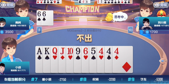 另一局比赛里,小战与南柯在本局中甚至打出了“上帝视角”过牌的精彩操作,却被刘川枫一手王炸轻松化解。作为农民的小战面对地主没有对子手牌时,打出神助攻的对3让队友南柯过牌对6,此时作为地主不王炸的话农民接着出顺子获胜,然而刘川枫一手王炸完全超越了二人对牌局的判断,成功拿下本盘积分。