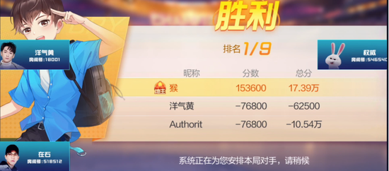 在B组中最为高光的时刻还是在洋气黄、权威、在石同时争夺地主、超级加倍的一局比赛里,最终在石以单局获得17.39万积分结束比赛。通过这一局的收入在石的总积分直接碾压A、B两组所有选手积分!甚至连解说都惊讶的说:这一局17万的积分很大可能直接拿到最终比赛的奖励!