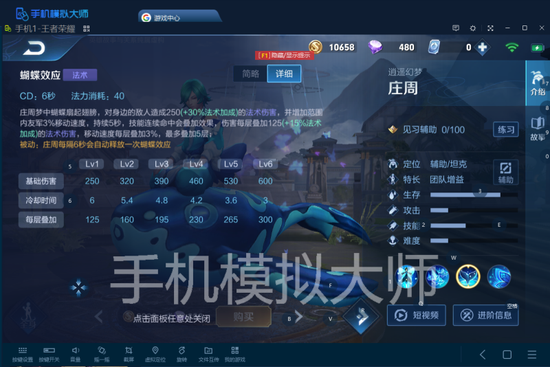 团战时庄周又可凭借回 血优势在人群中来去穿梭,周围目标越多,庄周的群攻能让他吸血更多。穿梭攻击越久叠加的伤害也越高,叠满时最好去攻击对方主力输出,对方如果有英雄用控制技能阻挠,庄周被动是6秒一次解控,大招可以立即给队友和自己解控并减伤。