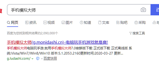 1.进搜索网站如百度搜索“手机模拟大师”,跳过顶部广告字样链接,进入官网下载安装。