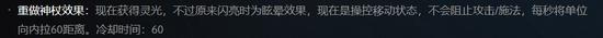 现在灵光在闪亮时,英雄不再是被眩晕状态,为操控移动状态。简单来说就是现在英雄被灵光拉住时,可以使用物品,可以普攻,可以施法。敌法师可以在灵光内向面朝的方向B走,巫医可以在灵光内持续施法使用“死亡守卫”,所有英雄都可以在被灵光牵引时开启黑皇杖或是使用回程卷轴,也意味着远程英雄被光法灵光牵引时,可以很轻松就用普攻摧毁灵光。因此各位玩家在选择光之守卫,选择阿哈利姆神杖的出装之前要三思了,可能现在光法的定位更加偏向于奶推体系,而非之前起到团控和减CD的作用。