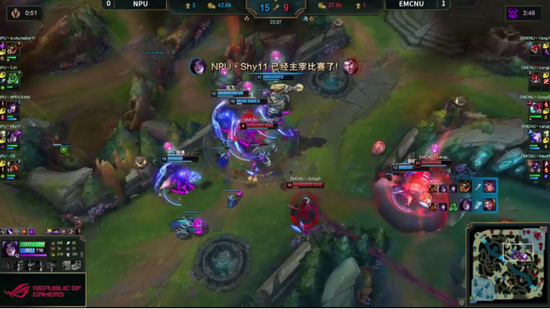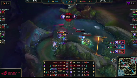 不过,EMCNU的心态并没有受到上一波团战失利的影响。虽然前期战队在下路吃了个大亏,但EMCNU在后续的比赛中稳扎稳打,尽量避开与NPU战队的正面团战安稳发育,终于在11分钟时找到了一波机会!在这波团战中,NPU战队的打野扎克率先埋伏在中路靠上的草丛中等待“有缘人”,结果左等右等只等来了“一头牛”。NPU战队就选择集火老牛,扎克、阿狸、泰坦的技能几乎全部交给了牛头,哪知道老牛身后还跟的有一群队友,技能扔完了的NPU战队众人只能是向后拉扯。EMCNU战队的AD寒冰抓住机会,追着NPU众人一通狂点,成功拿到四杀!就在正当解说们都在高呼五杀即将诞生时,杰斯无情的一个平A抢下了队友的一个人头,卡莎遗憾的痛失五杀。