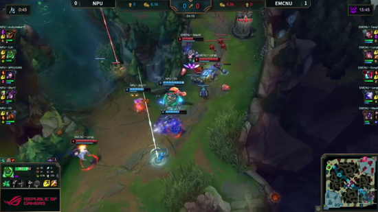 在比赛前期,双方选手的火药味非常足!在比赛刚刚过了四分钟,双方选手的等级大部分才三级的时候就在下路爆发了一场5V5的团战!NPU战队的打野选手本是想着在草丛中蹲一下,哪知道泰坦刚刚一个钩子上去逼出闪现,扎克露头的瞬间,双方战队的上单选手就同时亮起TP。而EMCNU战队的打野莉莉娅也支援到位,双方在下路开始拉扯。事实证明,NPU战队第二局变阵是真的有用,在牛头先手开团的情况下,控制链更加充足的NPU战队展现出了阵容的强势,鳄鱼、扎克、泰坦轮流前冲,直接冲散了EMCNU战队的阵容,卡莎在后方一波疯狂输出拿到三杀,比赛四分钟时NPU战队就完成了一波精彩的0换3。