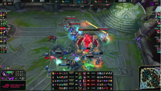 到了中期,双方战队在经过了几场精彩的团战之后再次站到了同一起跑线,经济都来到了31.5K左右。在经济持平的时候,NPU战队的阵容优势再次凸显出来!还是那句话:控制链太足了!扎克加泰坦的双控制组合本身已经非常强势,再加上一个大鳄鱼冲阵,EMCNU战队的选手只要吃到一个控制技能,后续源源不断的控制技能就接踵而至!就像18分30秒的这波中路小规模团战一样,扎克上前拉住敌方打野、ADC两人,泰坦直接扔钩放大,还没等人落地呢,扎克的大招又砸了下来!可怜EMCNU的两兄弟脚都没能落地就被一波控制链给击杀了。