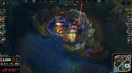 双方在这之后,各种大小规模团战中打的有来有回,人头差和经济差也咬的非常紧。在25分钟时,TSG抓住CMG鳄鱼不在的机会,对在下路带线的男枪和维克托打出了一波5包2,率先取得了人数上的优势,鳄鱼此时姗姗来迟,只能看着队友在敌方下路野区相继倒下。打赢团战后,TSG果断选择RUSH大龙,鳄鱼在大龙血量过半时,点爆炸果实进入龙坑,和辅助女坦一起2V5。渴血战斧和血手在手,已然装备成型的鳄鱼,强大的持续作战能力让他在挨打的同时已久能保持一个健康状态,撑到队友复活前来支援。TSG虽然拿下大龙但也险些被团灭,只有小鱼人交闪逃过一劫。