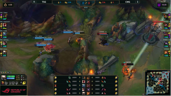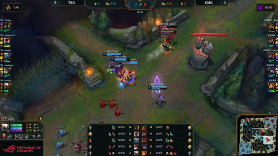 一级团TSG的5人想要对在F6处的CMG鳄鱼和男枪下手,TSG萨米拉先手远程Q技能打残鳄鱼,潘森满怒W并挂上点燃。但是由于TSG的阵型拉得有些开,并且鳄鱼当场加点E技能,最终得以逃生。TSG付出一个点燃的情况下颗粒无收,反而是自方盲僧血量被男枪打残只能回家补给,浪费了第一波刷野的时间。而CMG及时变通,和维克托进行了中上换线,鳄鱼回城补给完毕之后和兵线一起出发,来到线程比较短的中路。TSG似乎也预料到对手换线的战术,也随之进行了中上换线。