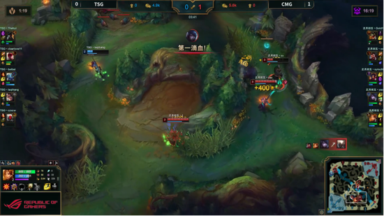 TSG下路双人组找节奏失败,反而是被CMG的辅助日女后发先至抓住机会配合男枪打残萨米拉,辅助潘森顶盾掩护萨米拉撤退,这时CMD的AD厄斐琉斯已经处理完兵线也赶到,并在男枪和日女的配合和保护下收掉潘森,拿到本场比赛的一血。