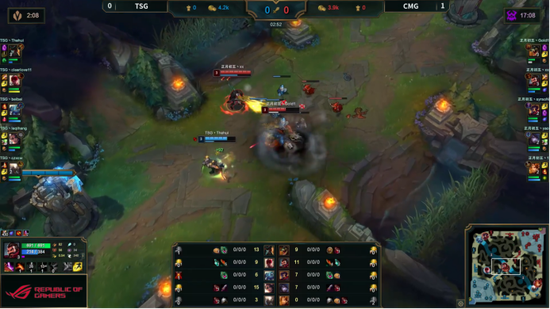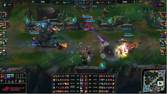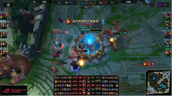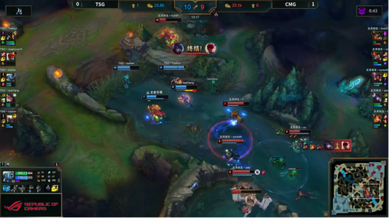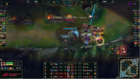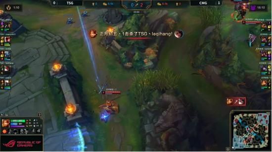 比赛时间来到七分钟,CMG除了维克托以外四人包下,男枪鳄鱼各自用技能过墙,TSG盲僧看到后第一时间向后交闪逃跑。而此时CMG的兵线已经进到蓝方塔下,CMG四人已经完成包夹的阵型,TSG下路双人组无奈双拳难敌四手,最终双双倒在了自家防御塔之下。赢得下路这波团战之后,男枪也顺势收掉第一条土龙。