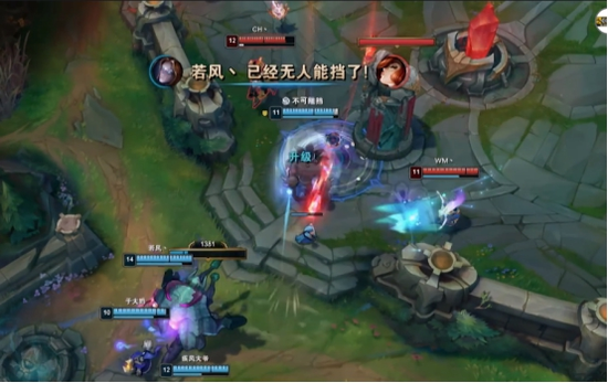 不过再秀的人也难免会有失误,比如说这一波若风一人上了高低,面对三人围剿,已经没有了操作和走位的空间,最后被王勉的拉克丝大中,再度送出大人头。