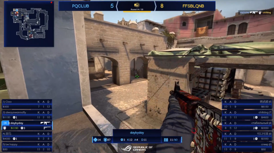 之后FF更加小心谨慎,率先拿到六分,PQ也调整好状态,开始大力反扑,正所谓“不要让CT拿到AK”这句话一样,PQ战队捡到AK如虎添翼,连续追分,差点将比分扳平。直到FF战队可口可乐的大狙手感火热连下两人,这才扼制住PQ拿分的势头,重新打开了FF的局面。第十四局daybyday”枪男”级别的残局发挥,让PQ战队气势暴增,拿下上半场最后两分,PQ与FF比分来到7:8。