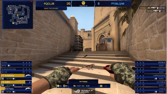 随后FF全员冲锋枪,PQ一把沙鹰加两把P250,FF凭借枪械优势再下一城。第三局PQ五人直接掏出AK,利用敌台和内场高台里应外合成功反扑FF。接下去的几局中,PQ以闪电之势连续得分反超FF。在第十一局中的残局,眼看PQ的连胜就要被终结,但是FF最后一人封烟失误导致被be happy点掉,没能拆除炸弹,PQ得以继续连胜。