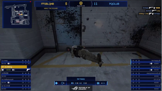下半场双方互换,FF五名“悍匪”齐齐RushA,经过内场时FF假打了几枪,吸引到PQ的注意力,导致外场直接被FF占领。PQ战队姗姗来迟的be happy在1v3残局中打掉两人,但是双拳难敌四手,PQ没能赢下手枪局。
