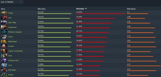胜率方面,位居前列的面孔可谓始终不变。在过去的一年中,孽主胜率高居第一,第二则是幽鬼,第三、第四名是冥魂大帝和宙斯。幽鬼同时也是过去一年中KDA最高的英雄。而如果把限制调为仅看7.28版本,那么幽鬼、宙斯、血魔的表现则有所下滑,孽主和大帝依然是常青树。克林克兹这个英雄异军突起,近来受到了越来越多玩家的关注,在职业赛场上也开始大放异彩。除此之外,司夜刺客、力丸包括天穹守望者的胜率都有所提升,对专精这些英雄的玩家来说是个不错的消息。