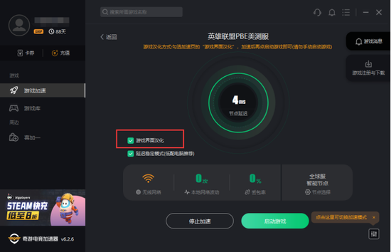 这时注意,回到奇游加速器,检查是否打开“游戏界面汉化”,打开汉化按钮后,启动游戏,就可以自动汉化游戏,玩上中文版本的PBE美测服啦~