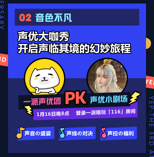 同时为感谢粉丝们的一路陪伴,官方正式推出“一派陪玩,音你不凡”品牌三周年升级主题活动,超多精彩活动蓄势待发、超多丰厚福利和限定好礼等你来拿!