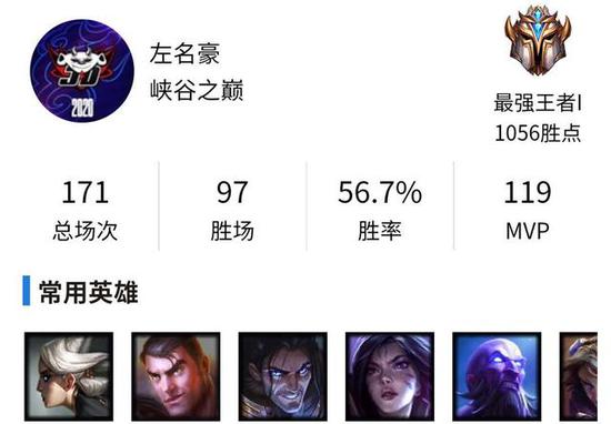 目前yagao的rank分是最强王者1056点,总成绩是97胜74负,胜率56.7%。常用英雄分别是:青钢影,杰斯,塞拉斯,卡莎,瑞兹,EZ,亚索,妖姬。