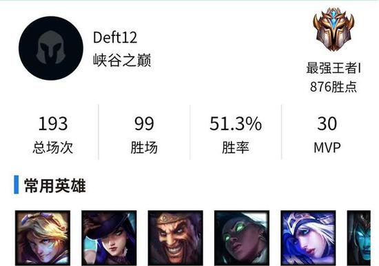 目前Deft的rank分是最强王者876点,总成绩是99胜94负,胜率51.3%。常用英雄分别是:EZ,女警,德莱文,赛娜,寒冰,复仇之矛。