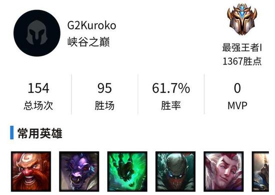 目前Mikyx的rank分是最强王者1367点,总成绩是95胜59负,胜率61.7%。常用英雄分别是:酒桶,牛头,锤石,派克,洛,潘森,莫甘娜,巴德,拉克丝,泰坦。